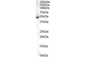 Peptide ELISA: Limit dilution 1: 32000. Western blot: 1-3 μg/mL. Approx.48 kDa band observed in lysates of Human Kidney and celllines Jurkat and A549 lysates (calculated MW of 46.8 kDa according to NP_055241.1).