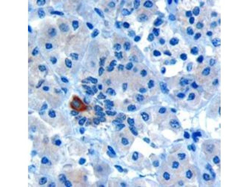 Peptide ELISA: antibody detection limit dilution 1: 8000. Immunohistochemistry: 5-10 μg/mL. In paraffin embedded Human Pancreas, shows strongcytoplasmic staining in rare cells of intralobular ducts. Recommended concentration,10 μg/mL. Also tested in paraffin embedded Human Heart where it shows speckled stainingon myocardial fibres in transverse section.