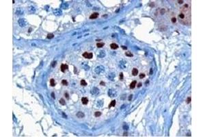 Peptide ELISA: Limit dilution 1: 32000. Western blot: 0.2-1 μg/mL. Approx 55-60 kDa band observed in Human Testis and Ovarylysates (predicted size of approx.50 kDa according to NP_002259.1). Immunohistochemistry: In paraffin embedded Human Testis, shows strong nuclearstaining of some cells in the seminiferous tubules (3 μg/mL). In paraffin embedded HumanSmall Intestine shows pixulate staining in nuclei of enterocytes (1-2 μg/mL).
