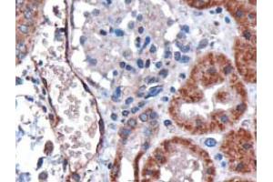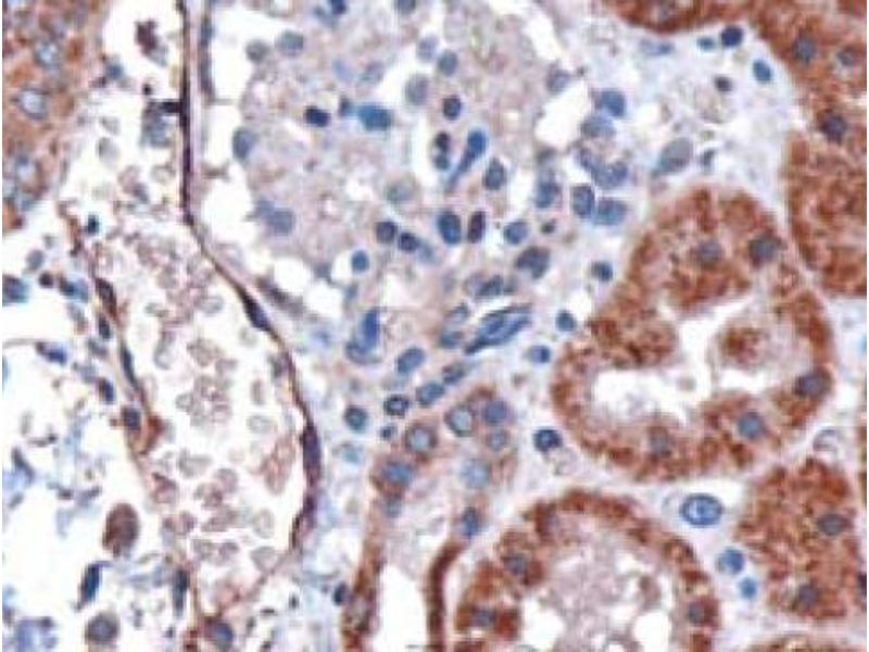 Peptide ELISA: Detection Limit: 1/16000. Western Blot: 0.1-0.3 μg/mL. Approx 35 kDa band observed in human kidney and humanliver lysates (calculated MW of 35.5 kDa according to NP_002027.2). Immunohistochemistry: 3 μg/mL. In paraffin embedded human kidney, stains epithelialcells of renal tubules and endothelial cells of vessels. The granular staining is compatiblewith the endoplasmic reticulum association of the protein. This antibody has also beensuccessfully used on Huamn Lung showing endothelial staining. FACS: A customer has reported Successful staining of HEK293S-TetR transfected with DARCreceptor at a dilution of 1/1000. Other applications not tested. Optimal dilutions are dependent on conditions and should be determined by the user.