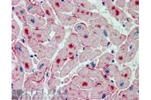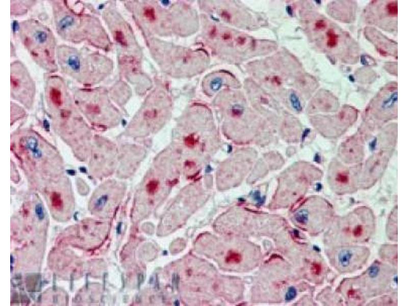 Peptide ELISA: 1/32000. Western Blot: 0.5-2 μg/mL. Approx 60 kDa band observed in Human Adipose, Heart andTestis lysates (calculated MW of 55.0 kDa according to NP_065109.1). Immunohistochemistry on Paraffin Sections: 2-3 μg/mL. In paraffin embedded Human Heart shows intense staining of distinct spots in themyocardial fibres in transverse section. Other applications not tested. Optimal dilutions are dependent on conditions and should be determined by the user.