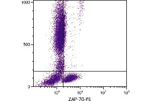 ZAP 70, also known as TCR associated protein, is a protein tyrosine kinase (PTK) with the primary role of catalyzing the phosphorylation of tyrosine residues in cellular proteins, and thus, contributes significantly to the initiation of cell signaling. ZAP 70 is expressed on T cells and NK cells. The monoclonal antibodies SB70 and SBZAP were generated against a KLH-peptide sequence corresponding to the human ZAP 70 AA 280-309.