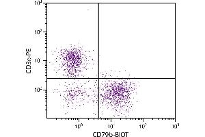 CD79 is a 23/21 kDa disulfide-linked heterodimer composed of an α chain (CD79a/mb-1) and a β chain (CD79b/B29) that associates non-covalently with membrane immunoglobulin (Ig) to form the B cell receptor (BCR) complex. Its expression is restricted to B lymphocytes, first appearing on the surface at the pro-B cell stage prior to productive Ig gene rearrangements and remaining through all stages of B-cell differentiation prior to plasma cells. It has been proposed that the CD79 complex on pro-B cell surfaces may function to induce early B-cell differentiation.