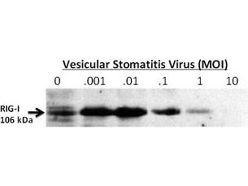 This RIG-I antibody is generated from rabbits immunized with a KLH conjugated synthetic peptide between 894-925 amino acids from the C-terminal region of human RIG-I.