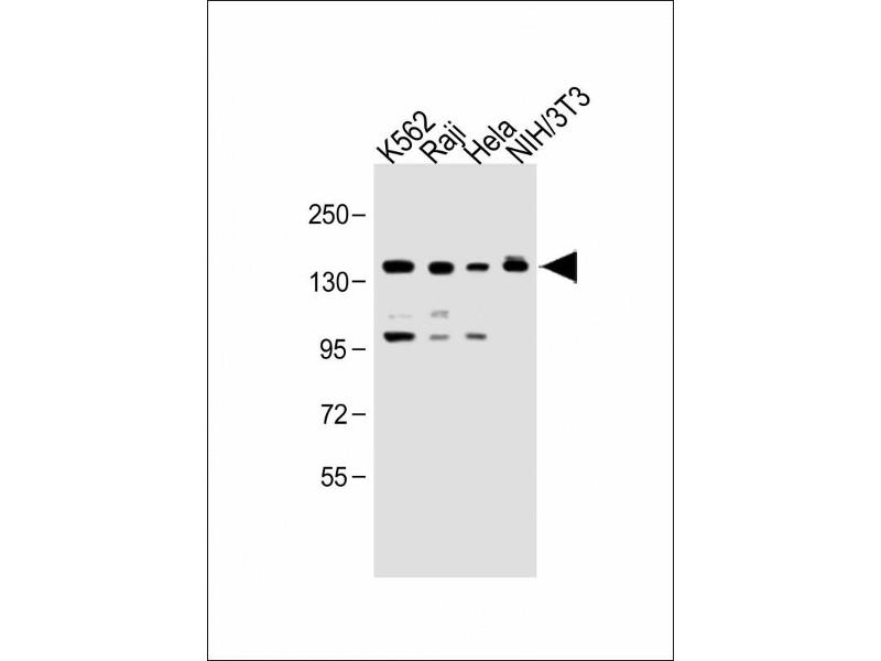 This UBE4B antibody is generated from rabbits immunized with a KLH conjugated synthetic peptide between 112-142 amino acids from the N-terminal region of human UBE4B.