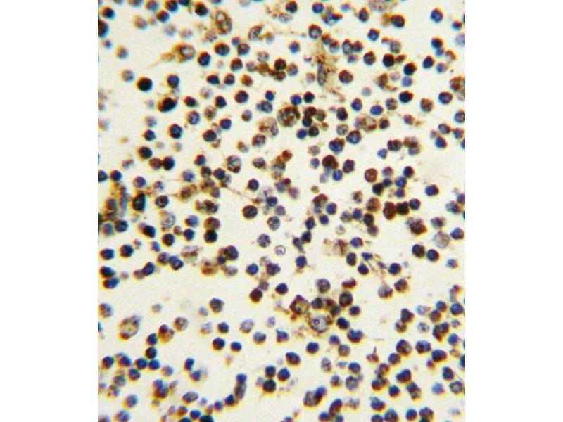 This NPM1 antibody is generated from rabbits immunized with a KLH conjugated synthetic peptide between 7-33 amino acids from the N-terminal region of human NPM1.