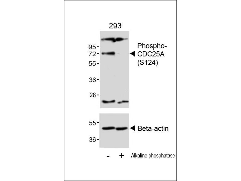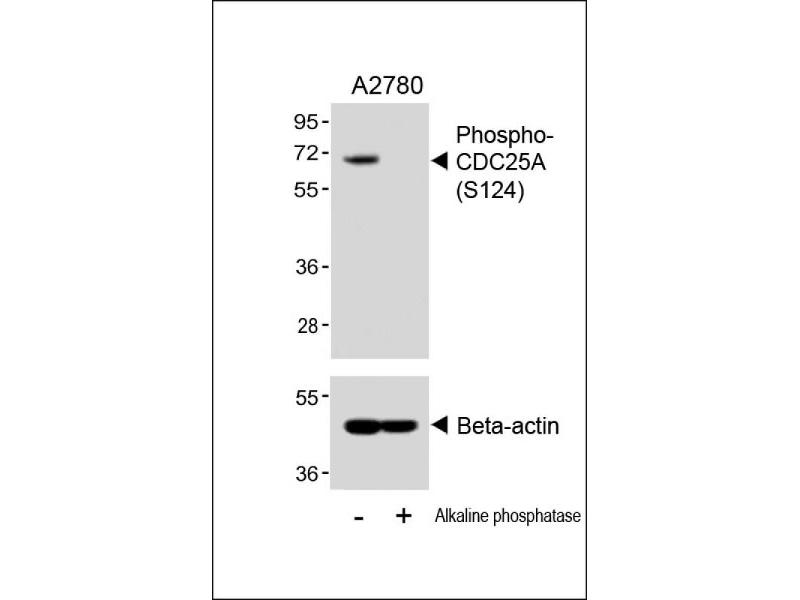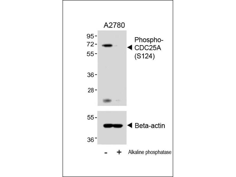 This CDC25A Antibody is generated from rabbits immunized with a KLH conjugated synthetic phosphopeptide corresponding to amino acid residues surrounding S124 of human CDC25A.
