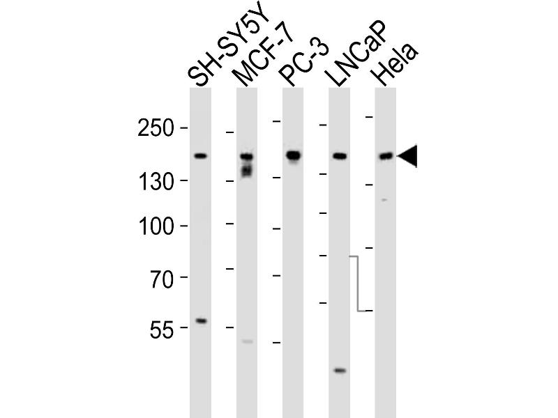This Tuberin (TSC2) antibody is generated from rabbits immunized with a KLH conjugated synthetic peptide between 1776-1805 amino acids from human Tuberin (TSC2).
