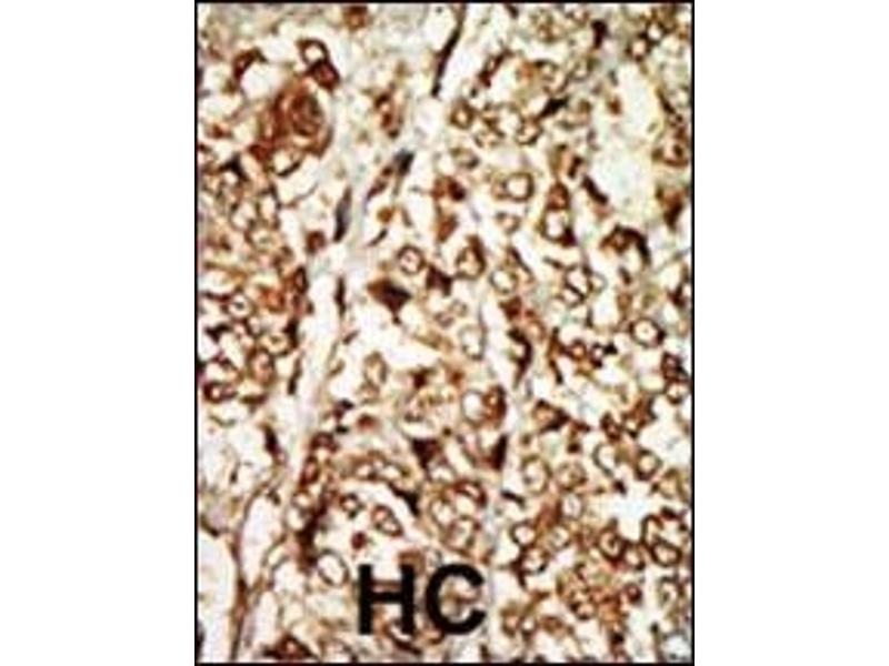 This MOS antibody is generated from rabbits immunized with a KLH conjugated synthetic peptide between 1-30 amino acids from the N-terminal region of human MOS.