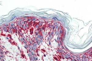 - Reacts with both cell surface-expressed and soluble form of CD44 antigen (Phagocyte glycoprotein 1), a 80-95 kD transmembrane glycoprotein (hyaladherin family) present on the most of cells and tissues (leukocytes, endothelial cells, mesenchymal cells, etc.), it is negative on platelets and hepatocytes.
