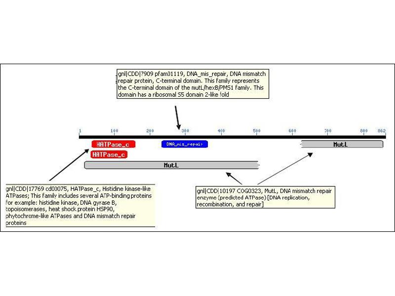 PMS2 is a highly conserved nuclear protein involved in mismatch repair during DNA replication and has been identified to be composed as a heterodimer of PMS2 and MLH1. PMS is part of the BRCA1-associated genome surveillance complex (BASC), which contains BRCA1, MSH2, MSH6, MLH1, ATM, BLM, PMS2 and the RAD50-MRE11-NBS1 protein complex. This association could be a dynamic process changing throughout the cell cycle and within subnuclear domains. Defects in PMS2 are the cause of hereditary non-polyposis colorectal cancer type 4 (HNPCC4), Turcot syndrome (an autosomal dominant disorder characterized by malignant tumors of the brain associated with multiple colorectal adenomas) and supratentorial primitive neuroectodermal tumors with cafe-au-lait spots (SNTCL). The human PMS2 gene encodes an 862 aa, 96 kDa polypeptide.Synonyms: DNA mismatch repair protein PMS2, Mismatch repair endonuclease PMS2, PMS1 protein homolog 2, PMSL2