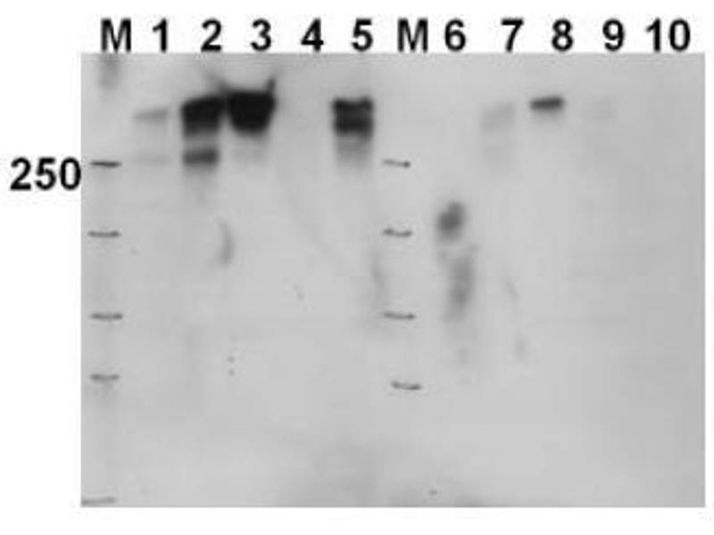 DNA dependent Protein Kinase (also called DNAPK, DNPK1, HYRC1, Protein Kinase DNA Activated Catalytic Polypeptide, XRCC7 and p460) consists of the 460 kDa DNA PKcs and a heterodimeric regulatory complex comprised of p70 Ku and p80 Ku (Ku autoantigen). DNA PKcs is a nuclear protein serine/threonine kinase present in a wide variety of eukaryotic species. DNA PKcs phosphorylates transcription factors, Sp1, Oct-1, p53 and SV40 large T antigen. DNA PKcs is involved in repairing double stranded DNA breaks. At the onset of apoptosis, DNA PKcs is rapidly inactivated by cleavage of the catalytic subunit into smaller polypeptides. Proteolysis of DNA PKcs is inhibited by the cysteine protease inhibitors iodoacetamide and N-ethylmaleimide. Alternative splicing can occur for this protein to produce at least two isoforms.Synonyms: DNA-dependent protein kinase catalytic subunit, DNPK1, HYRC, HYRC1, p460