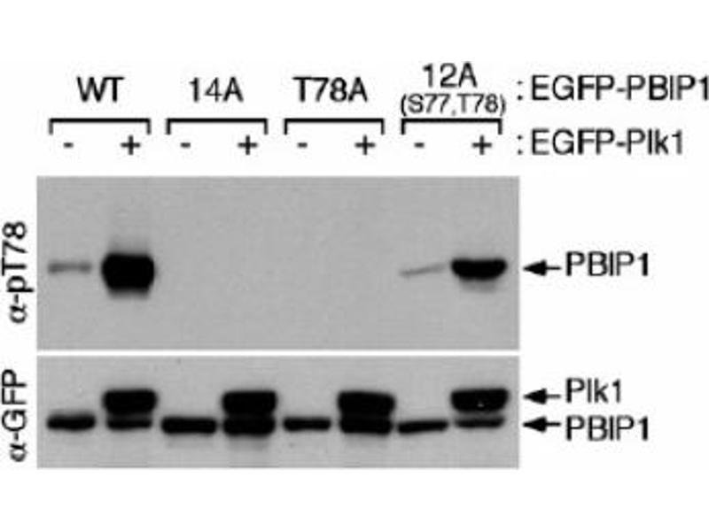 Myeloid leukemia factor-1 (MLF1) Interacting Protein (also known as PBIP1, MLF1IP1, KLIP1 or KSHV latent nuclear antigen interacting protein 1) is a novel pololike kinase 1 (Plk1) substrate. Plk1 phosphorylation of MLF1IP induces ubiquitination and degradation of MLF1IP prior to the metaphase/ anaphase transition. Several Plk1-dependent phosphorylation sites have been identified on MLF1IP by mass spectrometry. Mutations of these sites stabilize MLF1IP and inhibit mitotic progression. Subsequent in vitro and in vivo MLF1IP phosphorylation and stability assays have revealed that phosphorylation of Thr78 is critical for triggering Plk1-dependent MLF1IP degradation. Expression of a non-degradable Thr78Ala mutant was sufficient to induce a mitotic block. Timely phosphorylation of MLF1IP on Thr78 by Plk1 is critical for eliminating the MLF1IP-imposed mitotic block prior to anaphase onset. MLF1IP is speculated to be a novel tumor suppressor, whose function is required for proper sister-chromatid separation. Loss of MLF1IP function may result in improper segregation of chromosomes and genomic instability, thus promoting tumorigenesis.Synonyms: CENP-U(50), CENPU, Centromere protein U, ICEN24, Interphase centromere complex protein 24, KLIP1, KSHV latent nuclear antigen-interacting protein 1, MLF1-interacting protein, PBIP, Polo-box-interacting protein 1
