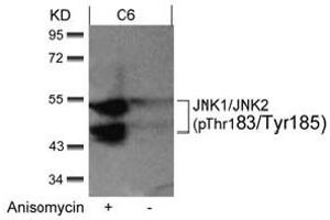 The antiserum was produced against synthesized phosphopeptide derived from human JNK1/JNK2 around the phosphorylation site of Thr183/Tyr185 (M-M-Tp-P-YP-V-V).