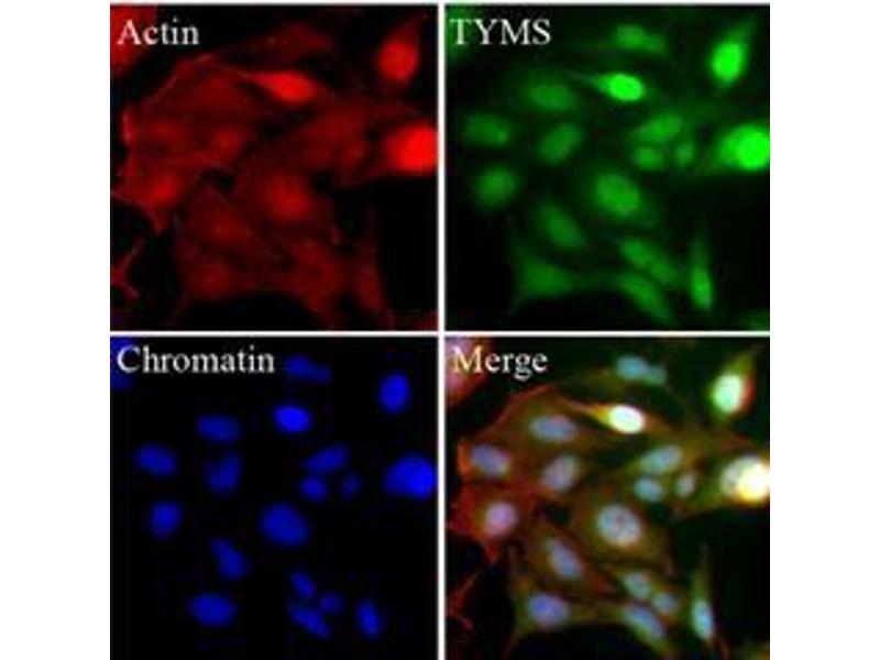 The methylation of deoxyuridine monophosphate (dUMP) to deoxythymidine monophosphate (dMTP) is an essential step for the formation of thymine nucleotides. This process is catalyzed by thymidylate synthase (TS or TYMS). TYMS is an intracellular enzyme that provides the sole de novo source of thymidylate in activity highest proliferating cells. Being the exclusive source of dTMP, TS is also an important target for anticancer agents such as 5-fluorouracil (5-FU). 5-FU acts as a TS inhibitor and is active against solid tumors such as colon, breast, head and neck. TS expression may be useful in predicting overall patient survival, but the prognostic value of TS expression continues to be a subject of investigation for different types of cancers.Synonyms: OK/SW-cl.29, TSase, TYMS