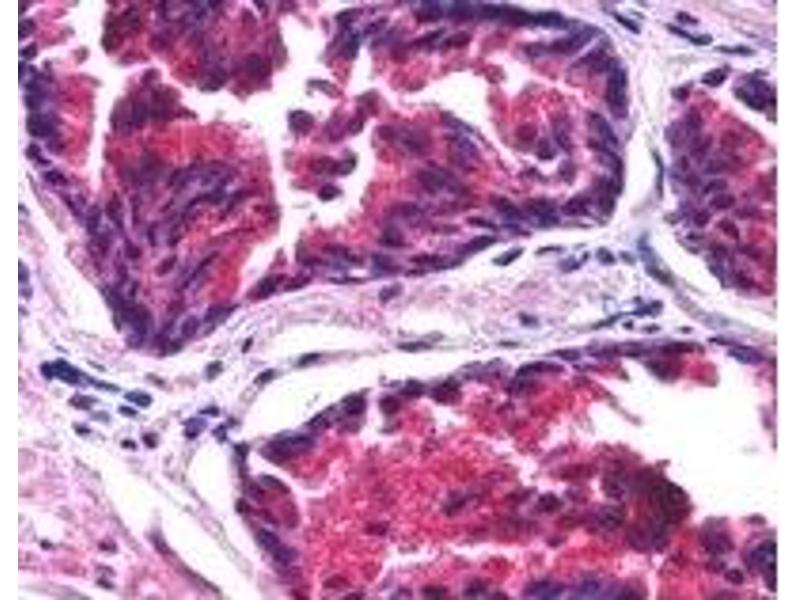 Peptide ELISA: Antibody Detection Limit Dilution: 1/32000. Western Blot: Preliminary experiments gave an approx 35 kDa band in human brain(hippocampus) lysates after 1 μg/mL antibody staining. Please note that currently wecannot find an explanation in the literature for the band we observe given the calculatedsize of 125 kDa according to NP_443180.2. The 35 kDa band was successfully blocked byincubation with the immunizing peptide. Immunohistochemistry: 1.25 μg/mL. In paraffin embedded Human Prostate shows cytoplasm staining of secretory cells in theglands. Other applications not tested. Optimal dilutions are dependent on conditions and should be determined by the user.