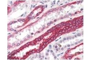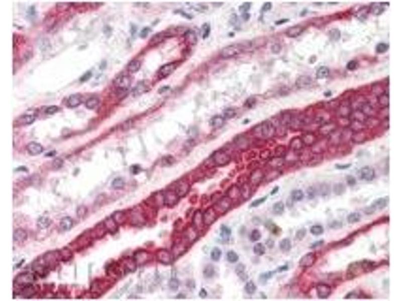 Peptide ELISA: Limit Dilution: 1/32000. Immunohistochemistry: 3-5 μg/mL. In paraffin embedded Human Kidney shows strongstaining of cytoplasm in DCT. Other applications not tested. Optimal dilutions are dependent on conditions and should be determined by the user.