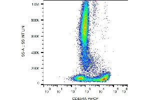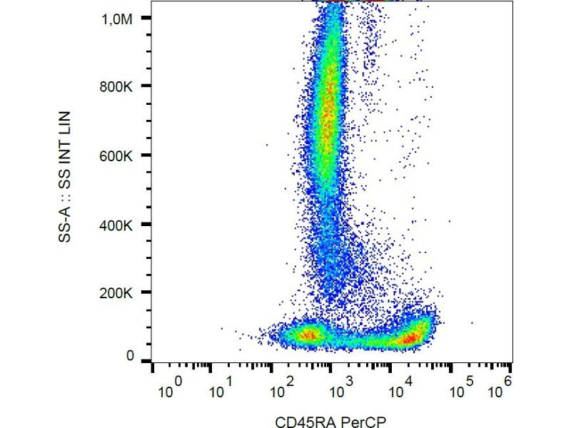CD45RA is a high molecular weight isoform of a receptor-type protein tyrosine phosphatase, CD45 glycoprotein. CD45 is crucial in lymphocyte development and antigen signaling, serving as an important regulator of Src-family kinases, promotes cell survival by modulating integrin-mediated signal transduction pathway and is also involved in DNA fragmentation during apoptosis. CD45 isoforms differ in their extracellular domains, whereas they share identical transmembrane and cytoplasmic domains. These isoforms differ in their ability to translocate into the glycosphingolipid-enriched membrane domains and their expression depends on cell type and physiological state of the cell. CD45RA is expressed e.g. on naïve T cells and normal plasma cells.,PTPRCR, T200RA