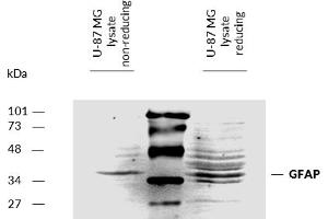 The mouse monoclonal antibody GA-5 reacts with GFAP, the principal marker of astroglial cells in the central nervous system, which is specifically expressed in satellite cells in peripheral ganglia and in non myelinating Schwann cells in peripheral nerves. The GFAP protein runs on gels at ~55 kDa protein, usually associated with lower Mw bands which are thought to be proteolytic fragments and alternate transcripts from the single gene.