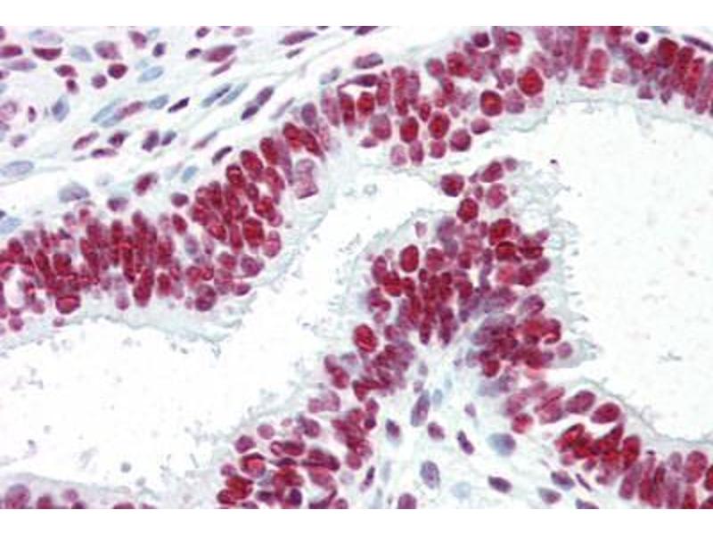 Usage: Immunohistochemistry: This antibody was validated for use in immunohistochemistry on a panel of 21 formalin-fixed, paraffin-embedded (FFPE) human tissues after heat induced antigen retrieval in pH 6.0 citrate buffer. After incubation with the primary antibody, slides were incubated with biotinylated secondary antibody, followed by alkaline phosphatase-streptavidin and chromogen. The stained slides were evaluated by a pathologist to confirm staining specificity. The optimal working concentration for this antibody was determined to be 5 μg/mL. -