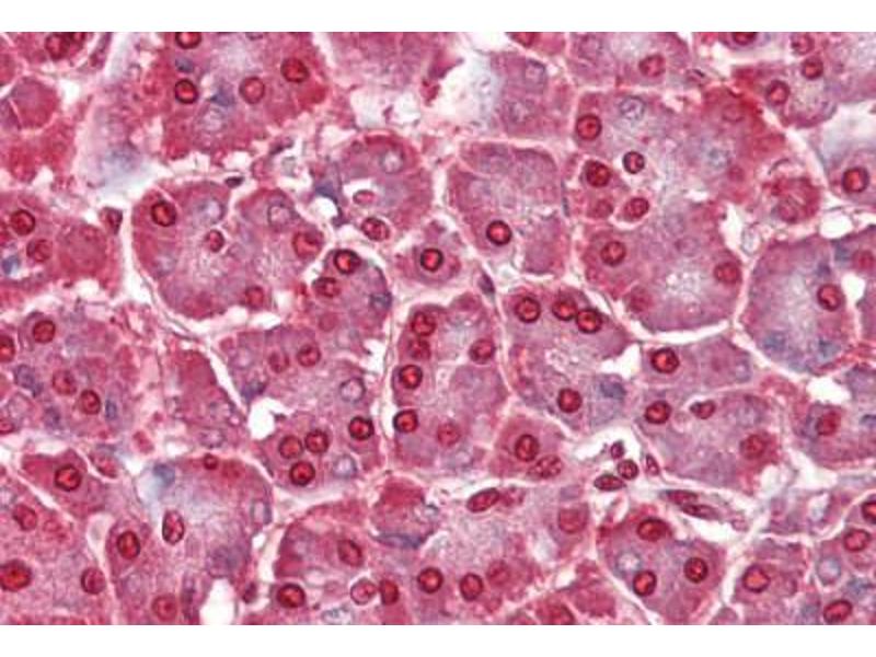 Usage: Immunohistochemistry: This antibody was validated for use in immunohistochemistry on a panel of 21 formalin-fixed, paraffin-embedded (FFPE) human tissues after heat induced antigen retrieval in  pH 6.0 citrate buffer. After incubation with the primary antibody, slides were incubated with biotinylated secondary antibody, followed by alkaline phosphatase-streptavidin and chromogen. The stained slides were evaluated by a pathologist to confirm staining specificity. The optimal working concentration for this antibody was determined to be 2.5 μg/mL.