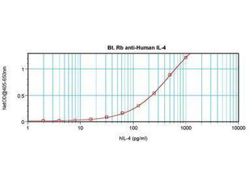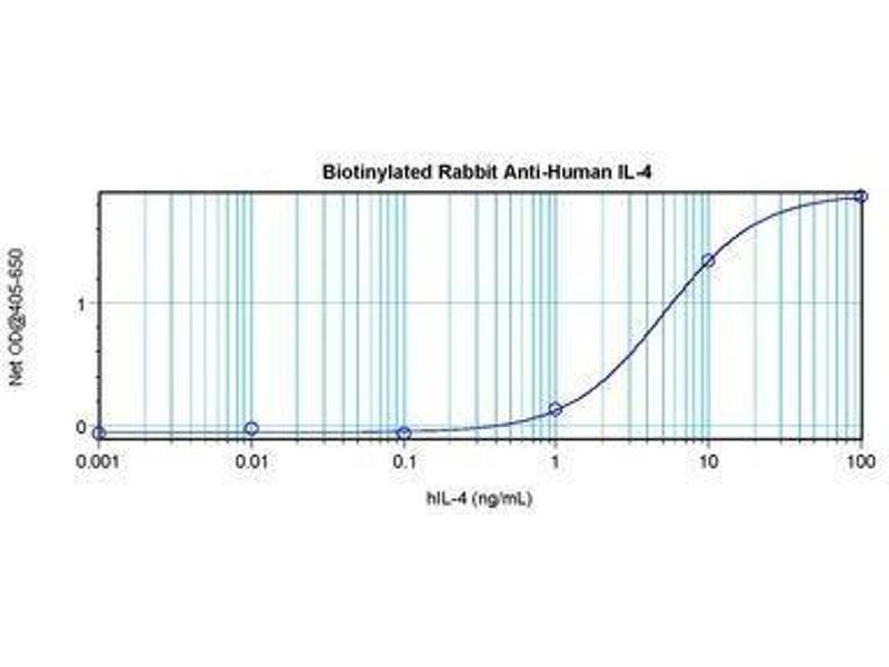 Usage: ELISA: To detect hIL-4 by direct ELISA (using 100 μL/well antibody solution) a concentration of 0.25-1 μg/mL of this antibody is required. This biotinylated polyclonal antibody, in conjunction with compatible secondary reagents, allows the detection of at least 0.2-0.4 ng/well of recombinant hIL-4. To detect hIL-4 by sandwich ELISA (using 100 μL/well antibody solution) a concentration of 0.25-1 μg/mL of this antibody is required. This biotinylated polyclonal antibody, in conjunction with Polyclonal Anti-Human IL-4 (LS-B7474) as a capture antibody, allows the detection of at least 0.2-0.4 ng/well of recombinant hIL-4. Western Blot: To detect hIL-4 by Western Blot analysis this antibody can be used at a concentration of 0.1-0.2 μg/mL. Used in conjunction with compatible secondary reagents the detection limit for recombinant hIL-4 is 1.5-3 ng/lane, under either reducing or non-reducing conditions. The applications listed have been tested for the unconjugated form of this product. Other forms have not been tested. -