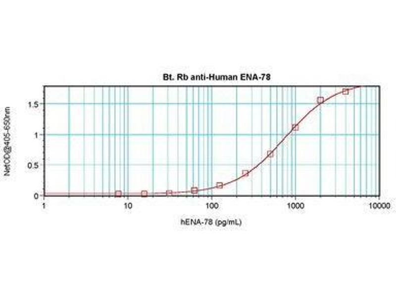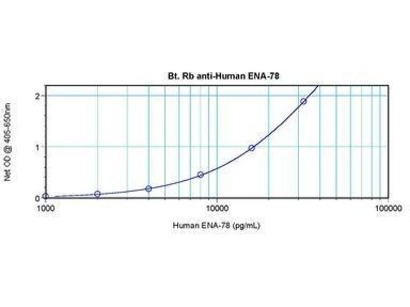 Usage: The applications listed have been tested for the unconjugated form of this product. Other forms have not been tested. ELISA: To detect hENA-78 by direct ELISA (using 100 μL/well antibody solution) a concentration of 0.25-1 μg/mL of this antibody is required. This biotinylated polyclonal antibody, in conjunction with compatible secondary reagents, allows the detection of at least 0.2-0.4 ng/well of recombinant hENA-78. To detect hENA-78 by sandwich ELISA (using 100 μL/well antibody solution) a concentration of 0.25-1 μg/mL of this antibody is required. This biotinylated polyclonal antibody, in conjunction with Polyclonal Anti-Human ENA-78 (LS-C104648) as a capture antibody, allows the detection of at least 0.2-0.4 ng/well of recombinant hENA-78. Western Blot: To detect hENA-78 by Western Blot analysis this antibody can be used at a concentration of 0.1-0.2 μg/mL. Used in conjunction with compatible secondary reagents the detection limit for recombinant hENA-78 is 1.5-3 ng/lane, under either reducing or non-reducing conditions. -