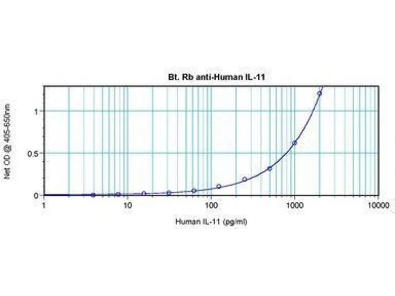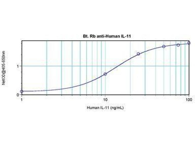 Usage: The applications listed have been tested for the unconjugated form of this product. Other forms have not been tested. ELISA: To detect hIL-11 by direct ELISA (using 100 μL/well antibody solution) a concentration of 0.25-1 μg/mL of this antibody is required. This biotinylated polyclonal antibody, in conjunction with compatible secondary reagents, allows the detection of at least 0.2-0.4 ng/well of recombinant hIL-11. To detect hIL-11 by sandwich ELISA (using 100 μL/well antibody solution) a concentration of 0.25-1 μg/mL of this antibody is required. This biotinylated polyclonal antibody, in conjunction with Polyclonal Anti-Human IL-11 (LS-C104366) as a capture antibody, allows the detection of at least 0.2-0.4 ng/well of recombinant hIL-11. Western Blot: To detect hIL-11 by Western Blot analysis this antibody can be used at a concentration of 0.1-0.2 μg/mL. Used in conjunction with compatible secondary reagents the detection limit for recombinant hIL-11 is 1.5-3 ng/lane, under either reducing or non-reducing conditions. -