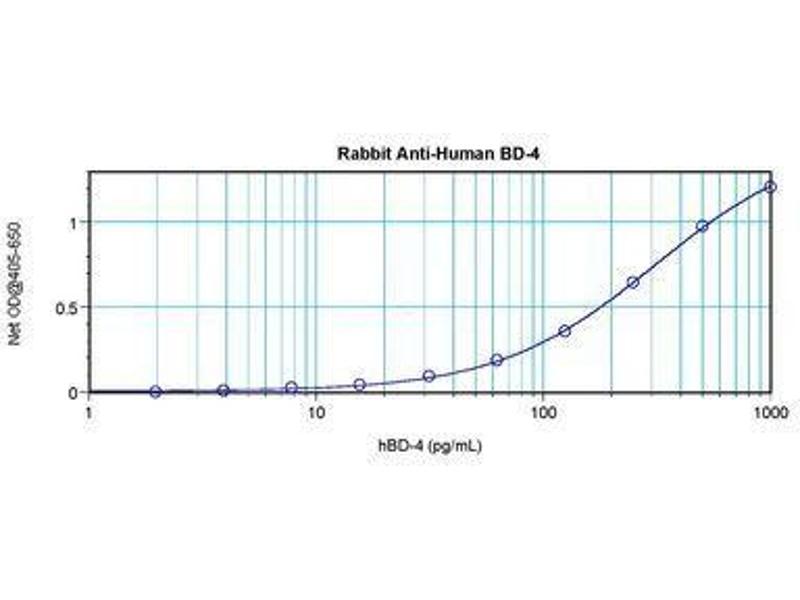 Usage: ELISA: To detect hBD-4 by sandwich ELISA (using 100 μL/well antibody solution) a concentration of 0.5-2 μg/mL of this antibody is required. This antigen affinity purified antibody, in conjunction with Biotinylated Anti-Human BD-4 (LS-C104739) as a detection antibody, allows the detection of at least 0.2-0.4 ng/well of recombinant hBD-4. Western Blot: To detect hBD-4 by Western Blot analysis this antibody can be used at a concentration of 0.1-0.2 μg/mL. Used in conjunction with compatible secondary reagents the detection limit for recombinant hBD-4 is 1.5-3 ng/lane, under either reducing or non-reducing conditions. -