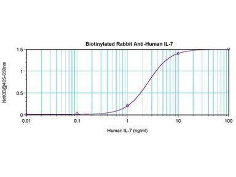 Usage: The applications listed have been tested for the unconjugated form of this product. Other forms have not been tested. ELISA: To detect Human IL-7 by direct ELISA (using 100 μL/well antibody solution) a concentration of 0.25-1 μg/mL of this antibody is required. This biotinylated polyclonal antibody, in conjunction with compatible secondary reagents, allows the detection of at least 0.2-0.4 ng/well of recombinant Human IL-7. To detect Human IL-7 by sandwich ELISA (using 100 μL/well antibody solution) a concentration of 0.25-1 μg/mL of this antibody is required. This biotinylated polyclonal antibody, in conjunction with Polyclonal Anti-Human IL-7 (LS-C104554) as a capture antibody, allows the detection of at least 0.2-0.4 ng/well of recombinant Human IL-7. Western Blot: To detect Human IL-7 by Western Blot analysis this antibody can be used at a concentration of 0.1-0.2 μg/mL. When used in conjunction with compatible secondary reagents, the detection limit for recombinant hIL-7 is 1.5-3 ng/lane, under either reducing or non-reducing conditions. -