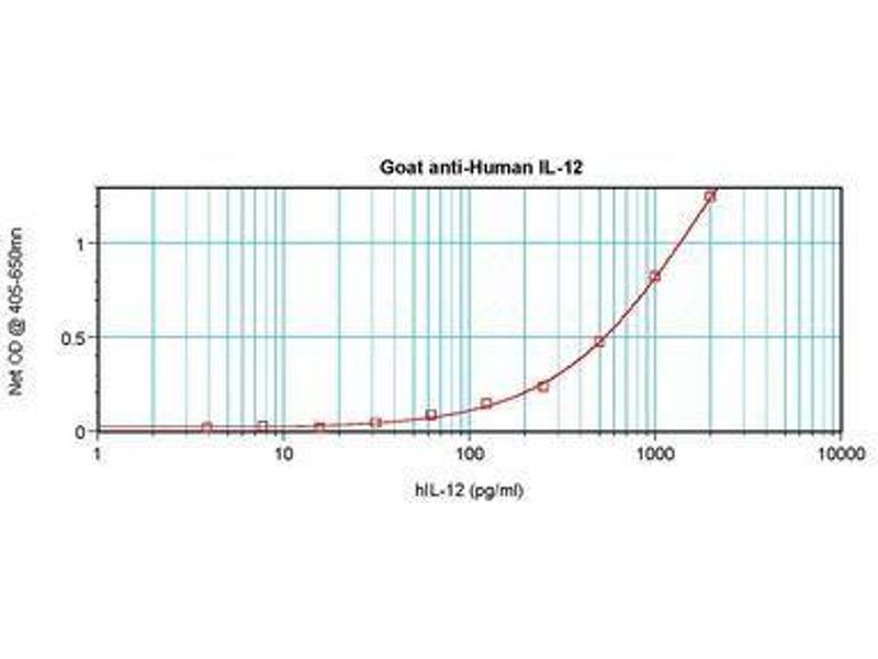 Usage: Neutralization: To yield one-half maximal inhibition [ND] of the biological activity of hIL-12 (0.3 ng/mL), a concentration of 012-02 μg/mL of this antibody is required. ELISA: To detect hIL-12 by sandwich ELISA (using 100 μL/well antibody solution) a concentration of 0.5-2 μg/mL of this antibody is required. This antigen affinity purified antibody, in conjunction with Biotinylated Anti-Human IL-12 (LS-C104425) as a detection antibody, allows the detection of at least 0.2-0.4 ng/well of recombinant hIL-12. Western Blot: To detect hIL-12 by Western Blot analysis this antibody can be used at a concentration of 0.1-0.2 μg/mL. Used in conjunction with compatible secondary reagents the detection limit for recombinant hIL-12 is 1.5-3 ng/lane, under either reducing or non-reducing conditions. -