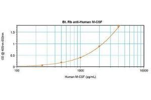 Usage: The applications listed have been tested for the unconjugated form of this product. Other forms have not been tested. ELISA: To detect hM-CSF by direct ELISA (using 100 μL/well antibody solution) a concentration of 0.25-1 μg/mL of this antibody is required. This biotinylated polyclonal antibody, in conjunction with compatible secondary reagents, allows the detection of at least 0.2-0.4 ng/well of recombinant hM-CSF. To detect hM-CSF by sandwich ELISA (using 100 μL/well antibody solution) a concentration of 0.25-1 μg/mL of this antibody is required. This biotinylated polyclonal antibody, in conjunction with Polyclonal Anti-Human M-CSF (LS-C104656) as a capture antibody, allows the detection of at least 0.2-0.4 ng/well of recombinant hM-CSF. Western Blot: To detect hM-CSF by Western Blot analysis this antibody can be used at a concentration of 0.1-0.2 μg/mL. Used in conjunction with compatible secondary reagents the detection limit for recombinant hM-CSF is 1.5-3 ng/lane, under either reducing or non-reducing conditions. -
