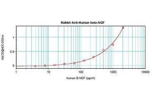Usage: Immunohistochemistry: This antibody stained formalin-fixed, paraffin-embedded sections of human pancreas adenocarcinoma. The recommended concentration is 0.5 mg/mL with an overnight incubation at 4 °C. An HRP-labeled polymer detection system was used with a DAB chromogen. Optimal results were achieved without antigen retrieval. Optimal concentrations and conditions may vary. Neutralization: To yield one-half maximal inhibition [ND50] of the biological activity of Human beta-NGF (1 ng/mL), a concentration of 0.05-0.08 μg/mL of this antibody is required. ELISA: To detect Human beta-NGF by sandwich ELISA (using 100 μL/well antibody solution) a concentration of 0.5-2 μg/mL of this antibody is required. This antigen affinity purified antibody, in conjunction with Biotinylated Anti-Human beta-NGF (LS-C104735) as a detection antibody, allows the detection of at least 0.2-0.4 ng/well of recombinant Human beta-NGF. Western Blot: To detect Human beta-NGF by Western Blot analysis this antibody can be used at a concentration of 0.1-0.2 μg/mL. When used in conjunction with compatible secondary reagents, the detection limit for recombinant Human beta-NGF is 1.5-3 ng/lane, under either reducing or non-reducing conditions. -