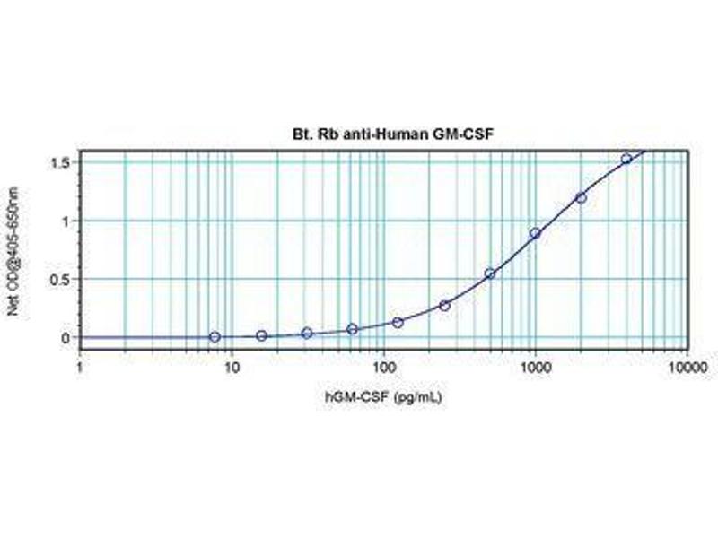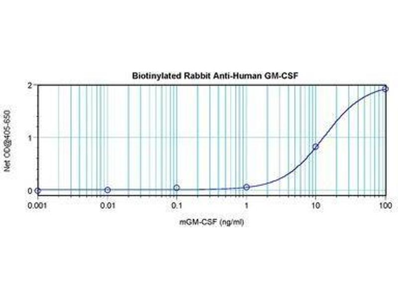 Usage: The applications listed have been tested for the unconjugated form of this product. Other forms have not been tested. ELISA: To detect hGM-CSF by direct ELISA (using 100 μL/well antibody solution) a concentration of 0.25-1 μg/mL of this antibody is required. This biotinylated polyclonal antibody, in conjunction with compatible secondary reagents, allows the detection of at least 0.2-0.4 ng/well of recombinant hGM-CSF. To detect hGM-CSF by sandwich ELISA (using 100 μL/well antibody solution) a concentration of 0.25-1 μg/mL of this antibody is required. This biotinylated polyclonal antibody, in conjunction with Polyclonal Anti-Human GM-CSF (LS-C104671) as a capture antibody, allows the detection of at least 0.2-0.4 ng/well of recombinant hGM-CSF. Western Blot: To detect hGM-CSF by Western Blot analysis this antibody can be used at a concentration of 0.1-0.2 μg/mL. Used in conjunction with compatible secondary reagents the detection limit for recombinant hGM-CSF is 1.5-3 ng/lane, under either reducing or non-reducing conditions. -