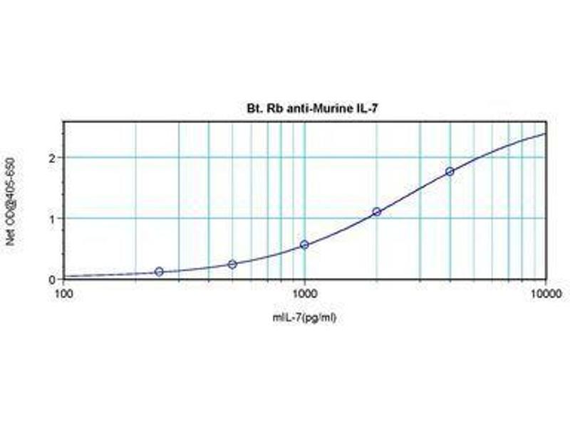 Usage: The applications listed have been tested for the unconjugated form of this product. Other forms have not been tested. ELISA: To detect Murine IL-7 by direct ELISA (using 100 μL/well antibody solution) a concentration of 0.25-1 μg/mL of this antibody is required. This biotinylated polyclonal antibody, in conjunction with compatible secondary reagents, allows the detection of at least 0.2-0.4 ng/well of recombinant Murine IL-7. To detect Murine IL-7 by sandwich ELISA (using 100 μL/well antibody solution) a concentration of 0.25-1 μg/mL of this antibody is required. This biotinylated polyclonal antibody, in conjunction with Polyclonal Anti-Murine IL-7 (LS-C104812) as a capture antibody, allows the detection of at least 0.2-0.4 ng/well of recombinant Murine IL-7. Western Blot: To detect Murine IL-7 by Western Blot analysis this antibody can be used at a concentration of 0.1-0.2 μg/mL. When used in conjunction with compatible secondary reagents the detection limit for recombinant Murine IL-7 is 1.5-3 ng/lane, under either reducing or non-reducing conditions. -