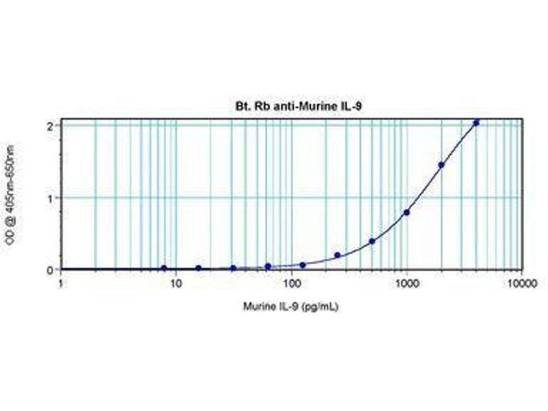 Usage: The applications listed have been tested for the unconjugated form of this product. Other forms have not been tested. ELISA: To detect Murine IL-9 by direct ELISA (using 100 μL/well antibody solution) a concentration of 0.25-1 μg/mL of this antibody is required. This biotinylated polyclonal antibody, in conjunction with compatible secondary reagents, allows the detection of at least 0.2-0.4 ng/well of recombinant Murine IL-9. To detect Murine IL-9 by sandwich ELISA (using 100 μL/well antibody solution) a concentration of 0.25-1 μg/mL of this antibody is required. This biotinylated polyclonal antibody, in conjunction with Polyclonal Anti-Murine IL-9 (LS-C104798) as a capture antibody, allows the detection of at least 0.2-0.4 ng/well of recombinant Murine IL-9. Western Blot: To detect Murine IL-9 by Western Blot analysis this antibody can be used at a concentration of 0.1-0.2 μg/mL. When used in conjunction with compatible secondary reagents, the detection limit for recombinant Murine IL-9 is 1.5-3 ng/lane, under either reducing or non-reducing conditions. -