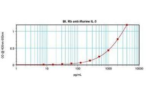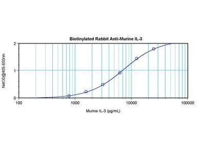 Usage: The applications listed have been tested for the unconjugated form of this product. Other forms have not been tested. ELISA: To detect mIL-3 by direct ELISA (using 100 μL/well antibody solution) a concentration of 0.25-1 μg/mL of this antibody is required. This biotinylated polyclonal antibody, in conjunction with compatible secondary reagents, allows the detection of at least 0.2-0.4 ng/well of recombinant mIL-3. To detect mIL-3 by sandwich ELISA (using 100 μL/well antibody solution) a concentration of 0.25-1 μg/mL of this antibody is required. This biotinylated polyclonal antibody, in conjunction with Polyclonal Anti-Murine IL-3 (LS-C104818) as a capture antibody, allows the detection of at least 0.2-0.4 ng/well of recombinant mIL-3. Western Blot: To detect mIL-3 by Western Blot analysis this antibody can be used at a concentration of 0.1-0.2 μg/mL. Used in conjunction with compatible secondary reagents the detection limit for recombinant mIL-3 is 1.5-3 ng/lane, under either reducing or non-reducing conditions. -