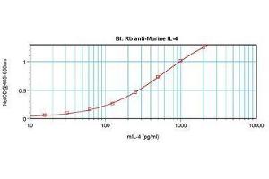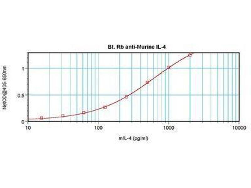 Usage: The applications listed have been tested for the unconjugated form of this product. Other forms have not been tested. ELISA: To detect Murine IL-4 by direct ELISA (using 100 μL/well antibody solution) a concentration of 0.25-1 μg/mL of this antibody is required. This biotinylated polyclonal antibody, in conjunction with compatible secondary reagents, allows the detection of at least 0.2-0.4 ng/well of recombinant Murine IL-4. To detect Murine IL-4 by sandwich ELISA (using 100 μL/well antibody solution) a concentration of 0.25-1 μg/mL of this antibody is required. This biotinylated polyclonal antibody, in conjunction with Polyclonal Anti-Murine IL-4 (LS-C104801) as a capture antibody, allows the detection of at least 0.2-0.4 ng/well of recombinant Murine IL-4. Western Blot: To detect Murine IL-4 by Western Blot analysis this antibody can be used at a concentration of 0.1-0.2 μg/mL. When used in conjunction with compatible secondary reagents the detection limit for recombinant Murine IL-4 is 1.5-3 ng/lane, under either reducing or non-reducing conditions. -