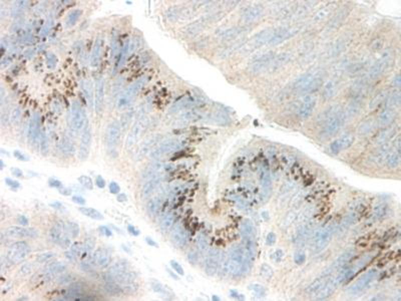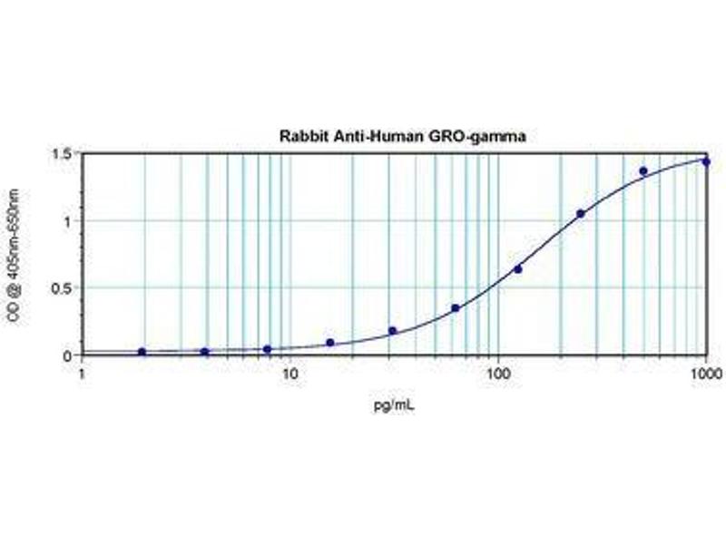 Usage: Immunohistochemistry: This antibody stained formalin-fixed, paraffin-embedded sections of human colon/rectum adenocarcinoma. The recommended concentration is 0.7 mg/mL-0.5 mg/mL with an overnight incubation at 4 °C. An HRP-labeled polymer detection system was used with a DAB chromogen. Heat induced antigen retrieval with a pH 6 sodium citrate buffer is recommended. Optimal concentrations and conditions may vary. Neutralization: To yield one-half maximal inhibition [ND] of the biological activity of Human GRO-gamma (100 ng/mL), a concentration of 1-2 μg/mL of this antibody is required. ELISA: To detect Human GRO-gamma by sandwich ELISA (using 100 μL/well antibody solution) a concentration of 0.5-2 μg/mL of this antibody is required. This antigen affinity purified antibody, in conjunction with Biotinylated Anti-Human GRO-gamma (LS-C104834) as a detection antibody, allows the detection of at least 0.2-0.4 ng/well of recombinant Human GRO-gamma. Western Blot: To detect Human GRO-gamma by Western Blot analysis this antibody can be used at a concentration of 0.1-0.2 μg/mL. When used in conjunction with compatible secondary reagents, the detection limit for recombinant Human GRO-gamma is 1.5-3 ng/lane, under either reducing or non-reducing conditions. -