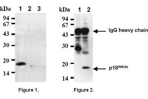 SDS-PAGE & Western Blotting1) Wash the cells 3 times with PBS and suspend with 10 volume of cold Lysis buffer (50 mMTris-HCl, pH 7. 2, 250 mM NaCl, 0. 1% NP-40, 2 mM EDTA, 10% glycerol) containingappropriate protease inhibitors. Incubate it at 4°C with rotating for 30 minutes, thensonicate briefly (up to 10 seconds). 2) Centrifuge the tube at 12,000 x g for 10 minutes at 4°C and transfer the supernatant toanother tube. Measure the protein concentration of the supernatant and add the Lysisbuffer to make 8 mg/mL solution. 3) Mix the sample with equal volume of Laemmli’s sample buffer. 4) Boil the samples for 2 minutes and centrifuge. Load 10 μL of the sample per lane in a 1mm thick SDS-polyacrylamide gel for electrophoresis. 5) Blot the protein to a polyvinylidene difluoride (PVDF) membrane at 1 mA/cm2 for 1 hourin a semi-dry transfer system. (Transfer Buffer: 25 mM Tris, 190 mM glycine, 20% MeOH). See the manufacture's manual for the transfer procedure. 6) To reduce nonspecific binding, soak the membrane in 10% skimmed milk (in PBS, pH7. 2) for 1 hour at room temperature, or overnight at 4°C. 7) Incubate the membrane with the anti-p18INK4c (DCS-118) monoclonal antibody (1μg/mL) diluted with 1% skimmed milk (in PBS, pH 7. 2) for 1 hour at room temperature. 8) Wash the membrane with PBS (5 minutes x 6 times). 9) Incubate the membrane with the 1: 10000 HRP-conjugated anti-mouse IgG diluted with1% skimmed milk (in PBS, pH 7. 2) for 1 hour at room temperature. 10) Wash the membrane with PBS (5 minutes x 6 times). 11) Wipe excess buffer from the membrane, then incubate it with appropriatechemiluminescence reagents for 1 minute. Remove extra reagent from the membrane bydabbing with a paper towel, and seal it in plastic wrap. 12) Expose to an X-ray film in a dark room for 5 minutes. Develop the film as usual. Theconditions for exposure and development may vary. Positive Control for Western blotting: Saos-2 cells. Immunoprecipitation1) Wash the cells 3 times with PBS and suspend with 10 volume of cold Lysis buffer (50 mMTris-HCl, pH 7. 2, 250 mM NaCl, 0. 1% NP-40, 2 mM EDTA, 10% glycerol) containingappropriate protease inhibitors. Incubate it at 4°C with rotating for 30 minutes, thensonicate briefly (up to 10 seconds). 2) Centrifuge the tube at 12,000 x g for 10 minutes at 4°C and transfer the supernatant toanother tube. 3) Add 3 μg of the anti-p18INK4c (DCS-118) monoclonal antibody into 250 μL of thesupernatant. Mix well and incubate with gentle agitation for 30-120 minutes at 4°C. Add 20μL of 50% Protein A-agarose beads resuspended in the Lysis buffer. Mix well and incubatewith gentle agitation for 60 minutes at 4°C. 4) Wash the beads 3-5 times with ice-cold Lysis buffer (centrifuge the tube at 2,500 x g for10 seconds). 5) Resuspend the beads in 20 μL of Laemmli’s sample buffer, boil for 3-5 minutes, andcentrifuge for 5 minutes. Use 10 μL/lane for the SDS-PAGE analysis. (See SDS-PAGE & Western blotting. )Positive Control for immunoprecipitation: Saos-2 cells.