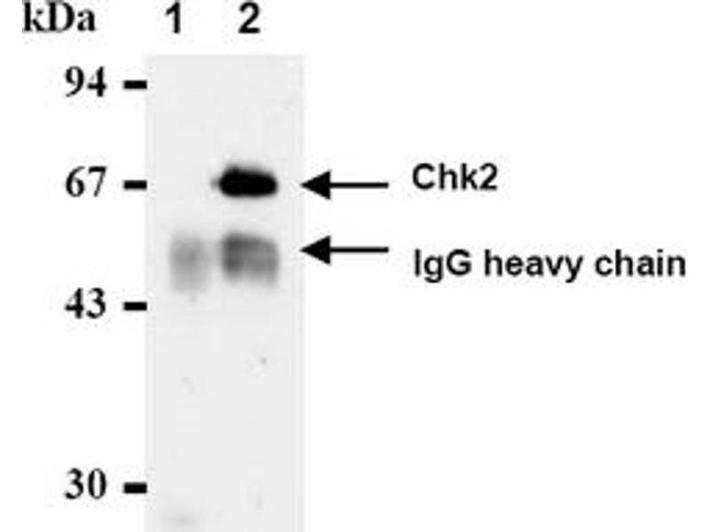SDS-PAGE & Western Blotting1) Wash the cells 3 times with PBS and suspend with 10 volume of cold Lysis buffer (50 mMTris-HCl, pH 7. 2, 250 mM NaCl, 0. 1% NP-40, 2 mM EDTA, 10% glycerol) containingappropriate protease inhibitors. Incubate it at 4°C with rotating for 30 minutes, thensonicate briefly (up to 10 seconds). 2) Centrifuge the tube at 12,000 x g for 10 minutes at 4°C and transfer the supernatant toanother tube. Measure the protein concentration of the supernatant and add the Lysisbuffer to make 8 mg/mL solution. 3) Mix the sample with equal volume of Laemmli’s sample buffer. 4) Boil the samples for 2 minutes and centrifuge. Load 10 μL of the sample per lane in a 1mm thick SDS-polyacrylamide gel for electrophoresis. 5) Blot the protein to a polyvinylidene difluoride (PVDF) membrane at 1 mA/cm2 for 1 hourin a semi-dry transfer system. (Transfer Buffer: 25 mM Tris, 190 mM glycine, 20% MeOH). See the manufacture's manual for the transfer procedure. 6) To reduce nonspecific binding, soak the membrane in 10% skimmed milk (in PBS, pH7. 2) for 1 hour at room temperature, or overnight at 4°C. 7) Incubate the membrane with the anti-Chk2 (DCS-270) monoclonal antibody (0. 2 μg/mL)diluted with 1% skimmed milk (in PBS, pH 7. 2) for 1 hour at room temperature. 8) Wash the membrane with PBS (5 minutes x 6 times). 9) Incubate the membrane with the 1: 10000 POD-conjugated anti-mouse IgG diluted with1% skimmed milk (in PBS, pH 7. 2) for 1 hour at room temperature. 10) Wash the membrane with PBS (5 minutes x 6 times). 11) Wipe excess buffer from the membrane, then incubate it with appropriatechemiluminescence reagents for 1 minute. Remove extra reagent from the membrane bydabbing with a paper towel, and seal it in plastic wrap. 12) Expose to an X-ray film in a dark room for 5 minutes. Develop the film as usual. Theconditions for exposure and development may vary. Positive Controls for Western blotting: HeLaImmunoprecipitation1) Wash the cells 3 times with PBS and suspend with 10 volume of cold Lysis buffer (50 mMTris-HCl, pH 7. 2, 250 mM NaCl, 0. 1% NP-40, 2 mM EDTA, 10% glycerol) containingappropriate protease inhibitors. Incubate it at 4°C with rotating for 30 minutes, thensonicate briefly (up to 10 seconds). 2) Centrifuge the tube at 12,000 x g for 10 minutes at 4°C and transfer the supernatant toanother tube. 3) Add 3 µg of the anti-Chk2 (DCS-270) monoclonalantibody into 250 µL of the supernatant. Mix well and incubate with gentle agitation for30-120 minutes at 4°C. Add 20 µL of 50% Protein A-agarose beads resuspended in the