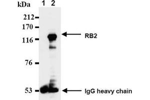 Immunoprecipitation / SDS PAGE & Western Blotting1) Wash the cells 3 times with PBS and suspend with 10 volume of cold Lysis buffer (50 mMTris-HCl, pH 7. 2, 250 mM NaCl, 0. 1% NP-40, 2 mM EDTA, 10% glycerol) containingappropriate protease inhibitors. Incubate it at 4°C with rotating for 30 minutes, thensonicate briefly (up to 10 seconds). 2) Centrifuge the tube at 12,000 x g for 10 minutes at 4°C and transfer the supernatant toanother tube. 3) Add 3 µL of the anti-RB2 monoclonal antibody into 200 µL of the supernatant. Mix welland incubate with gentle agitation for 30-120 minutes at 4°C. Add 20 µL of 50% ProteinA-agarose beads resuspended in the Lysis buffer. Mix well and incubate with gentleagitation for 60 minutes at 4°C. 4) Wash the beads 3-5 times with ice-cold Lysis buffer (centrifuge the tube at 2,500 x g for10 seconds). 5) Resuspend the beads in 20 µL of Laemmli's sample buffer, boil for 3-5 minutes, andcentrifuge for 5 minutes. Load 10 µL of the sample per lane in a 1 mm thickSDS-polyacrylamide gel for electrophoresis. 6) Blot the protein to a polyvinylidene difluoride (PVDF) membrane at 1 mA/cm2 for 1 hourin a semi-dry transfer system. (Transfer Buffer: 25 mM Tris, 190 mM glycine, 20% MeOH). See the manufacture's manual for precise transfer procedure. 7) To reduce nonspecific binding, soak the membrane in 10% skimmed milk (in PBS, pH7. 2) for 1 hour at room temperature, or overnight at 4°C. 8) Incubate the membrane with the anti-RB2 monoclonal antibody (1-5 µg/mL) diluted with1% skimmed milk (in PBS, pH 7. 2) for 1 hour at room temperature. 9) Wash the membrane with PBS (5 minutes x 6 times). 10) Incubate the membrane with the 1: 10000 POD-conjugated anti-mouse IgG diluted with1% skimmed milk (in PBS, pH 7. 2) for 1 hour at room temperature. 11) Wash the membrane with PBS (5 minutes x 6 times). 12) Wipe excess buffer on the membrane, then incubate it with appropriatechemiluminescence reagent for 1 minute. Remove extra reagent from the membrane bydabbing with paper towel, and seal it in plastic wrap. 13) Expose to an X-ray film in a dark room for 5 minutes. Develop the film as usual. Thecondition for exposure and development may vary. Positive Control for Immunoprecipitation/Western blotting: Jurkat