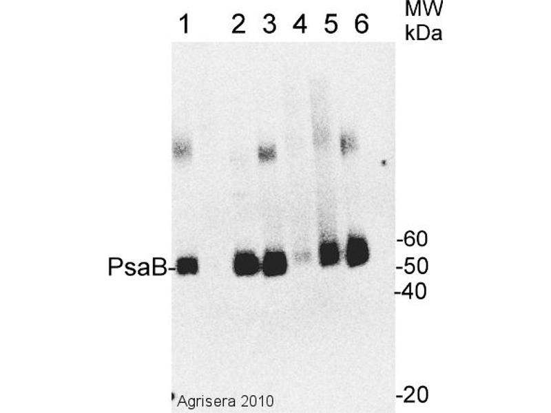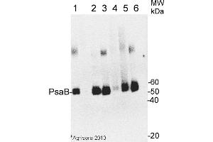 KLH-conjugated synthetic peptide derived from known PsaB sequences including Arabidopsis thaliana P56767, AtCg00340