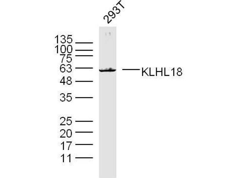 Background: KLHL18 is a 574 amino acid protein that is related to the Drosophila kelch protein, which is required to maintain actin organization in ovarian ring canals. Mutations affecting Kelch function result in failure of Kelch to associate with the ring canals and subsequent female sterility. Human KLHL18 protein contains six kelch repeats, one BACK (BTB/Kelch associated) domain and one BTB (POZ) domain. The BTB (Broad-Complex, Tramtrack and Bric a brac) domain, also known as the POZ (Poxvirus and Zinc finger) domain, is an N-terminal homodimerization domain that contains multiple copies of kelch repeats and/or C2H2-type zinc fingers. Proteins that contain BTB domains are thought to be involved in transcriptional regulation via control of chromatin structure and function. There are two isoforms of KLHL18 that are produced as a result of alternative splicing events.
