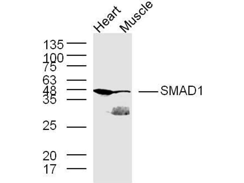 Background: Transcriptional modulator activated by BMP (bone morphogenetic proteins) type 1 receptor kinase. SMAD1 is a receptor-regulated SMAD (R-SMAD). SMAD1/OAZ1/PSMB4 complex mediates the degradation of the CREBBP/EP300 repressor SNIP1. May act synergistically with SMAD4 and YY1 in bone morphogenetic protein (BMP)-mediated cardiac-specific gene expression.