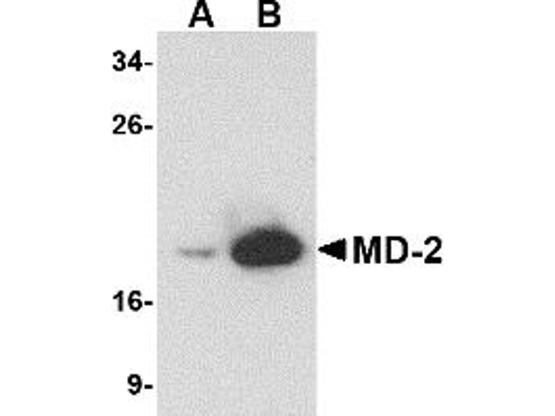 ELISA. Western Blot: MD2 antibody can be used for detection of MD2 at 0.5-1 μg/mL. Immunohistochemistry: 2.5 μg/mL Other applications not tested. Optimal dilutions are dependent on conditions and should be determined by the user.