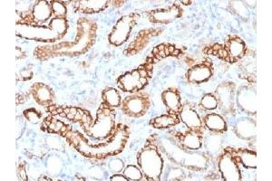 - Cadherins form a superfamily of related glycoproteins that mediate calcium-dependent cell adhesion and transmit signals from the extracellular matrix to the cytoplasm. Cadherins have been implicated in embryogenesis, tissue morphogenesis, tissue structure maintenance, cell polarization, neoplastic invasiveness and metastasis, and membrane transport. It is suggested that CDH16 (kidney-specific cadherin, Cadherin 16) is a marker for terminal differentiation of the basolateral membranes of renal tubular epithelial cells. Within the kidney, CDH16 is found exclusively in the basolateral membrane of renal tubular epithelial cells and collecting duct cells, and not in glomeruli, renal interstitial cells, or blood vessels. CDH16 has been suggested to distinguish Chromophobe Renal-Cell Carcinoma from Oncocytoma.