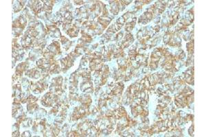 - Recognizes a 40-43 kDa transmembrane epithelial glycoprotein, identified as epithelial specific antigen (ESA), or epithelial cellular adhesion molecule (Ep-CAM). EpCAM is expressed on baso-lateral cell surface in most simple epithelia and a vast majority of carcinomas. This antibody has been used to distinguish adenocarcinoma from pleural mesothelioma and hepatocellular carcinoma. It is also useful in distinguishing serous carcinomas of the ovary from mesothelioma. This epithelial antigen plays an important role as a tumor-cell marker in lymph nodes from patients with esophageal carcinoma otherwise classified as node-negative. Epithelial antigen has also been suggested as a discriminator between basal cell and baso-squamous carcinomas, and squamous cell carcinoma of the skin.
