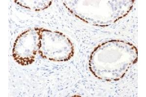 P63 is a homolog of the tumor suppressor p53. It is identified in basal cells in the epithelial layers of a variety of tissues, including epidermis, cervix, urothelium, breast and prostate. p63 was detected in nuclei of the basal epithelium in normal prostate glands, however, it was not expressed in malignant tumors of the prostate. As a result, p63 has been reported as a useful marker for differentiating benign from malignant lesions in the prostate, particularly when used in combination with markers of high molecular weight cytokeratins and the prostate-specific marker AMACR (P504S). p63 has also been shown to be a sensitive marker for lung squamous cell carcinomas (SqCC), with a sensitivity of ~90 % . Specificity for lung SqCC, vs. lung adenocarcinoma (LADC), is approximately 80 %. In breast tissue, p63 has been identified in myoepithelial cells of normal ducts.