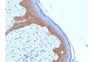 Recognizes a protein of 130 kDa, identified as Desmoglein-3 (DSG3). This MAb is highly specific to Desmoglein-3 and does not cross-react with other members of the Desmoglein-family. DSG3 is a calcium-binding transmembrane glycoprotein component of desmosomes in vertebrate epithelial cells. Desmosomes are cell-cell junctions between epithelial, myocardial, and certain other cell types. Currently, three desmoglein subfamily members are identified and all are members of the cadherin cell adhesion molecule superfamily.